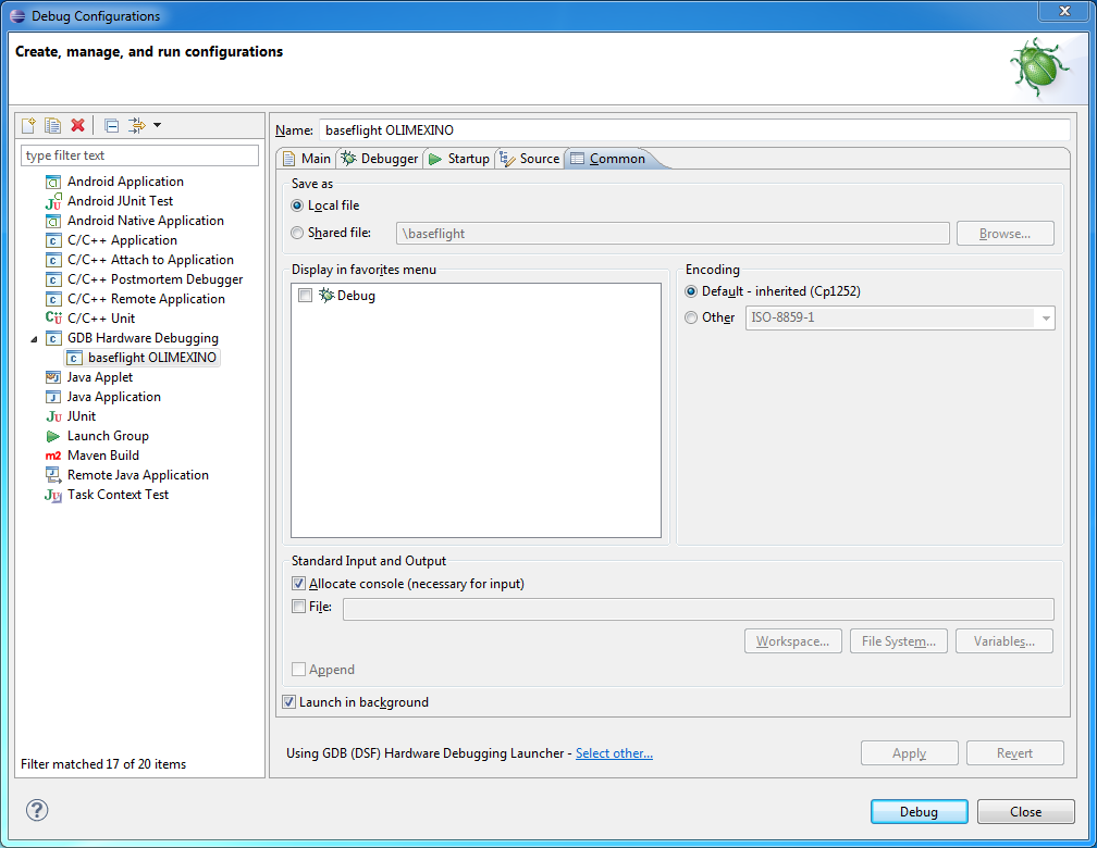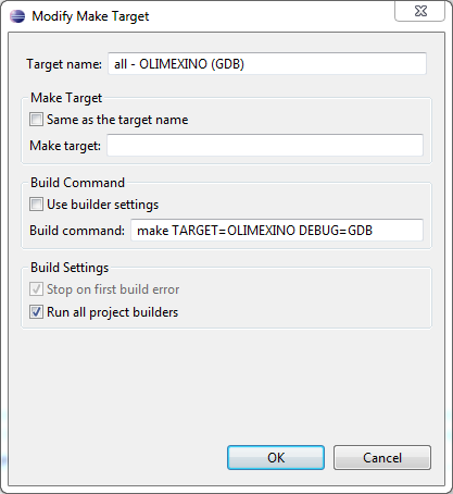 It's important to have build the executable compiled with GDB debugging information first. Select the appropriate .elf file (not hex file) - In these examples the target platform is an OLIMEXINO.