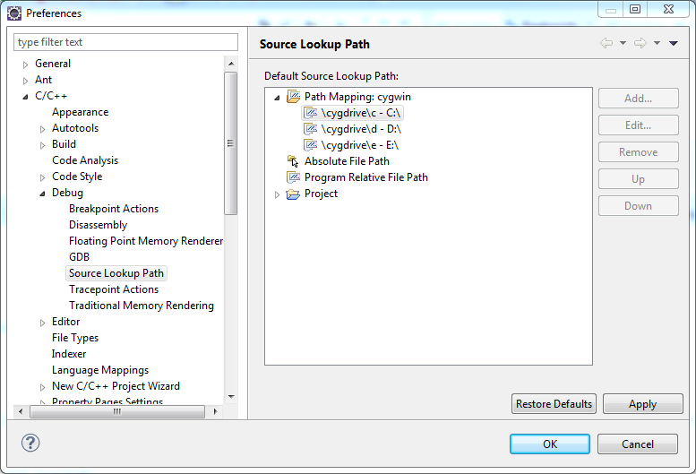 If you use cygwin an additional entry should be shown on the Source tab (not present in this screenshot)