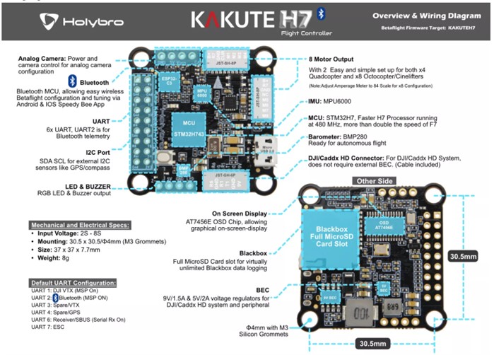 The Holybro Kakute H7 Flight Controller is full of features including integrated Bluetooth, dual plug-and-play 4in1 ESC ports, HD camera plug, barometer, OSD, 6x UARTs, full Blackbox MicroSD card slot, 5V and 9V BEC, easy soldering layout and much more.
